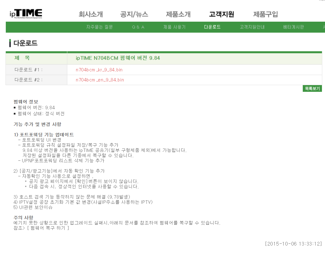 그중 속도 개선이 되는 구형 펌웨어 중 ipTIME N704BCM 펌웨어 버전 9.84 (2015-10-06) 가 최신(?)이었습니다.